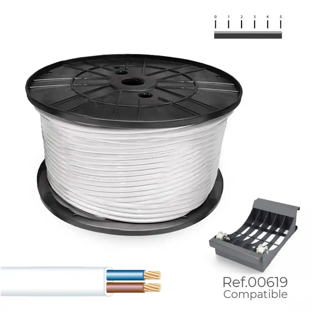 Esta manguera plana blanca, diseñada para instalaciones con una tensión nominal de 48V, cuenta con dos conductores de 1,50 mm². Se presenta en un práctico carrete de 200 metros de longitud, enrollada en una bobina grande cuyas dimensiones son 400 mm de diámetro por 200 mm de alto, lo que facilita su almacenamiento, transporte y despliegue durante la instalación.