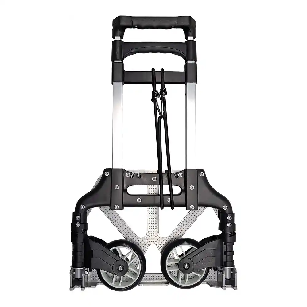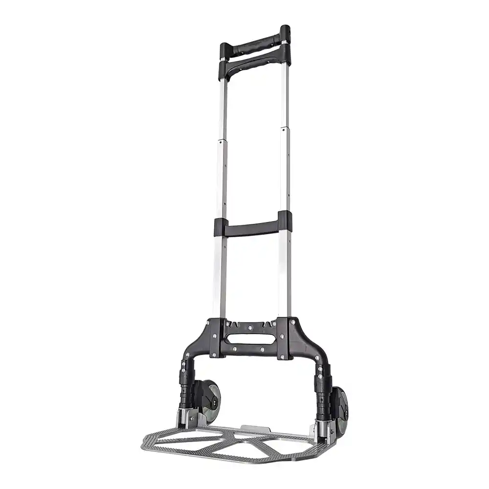 Este práctico carrito de transporte plegable, con cuerpo de aluminio reforzado, es ligero pero muy resistente, soportando un peso máximo de 60 kg. Cuenta con ruedas de 12 cm de diámetro para un movimiento suave y estable, e incluye una cinta de sujeción para asegurar la carga. Cuando está extendido, sus medidas son 100 cm de alto, 29 cm de ancho y 23 cm de fondo, y se pliega fácilmente para un almacenamiento compacto.