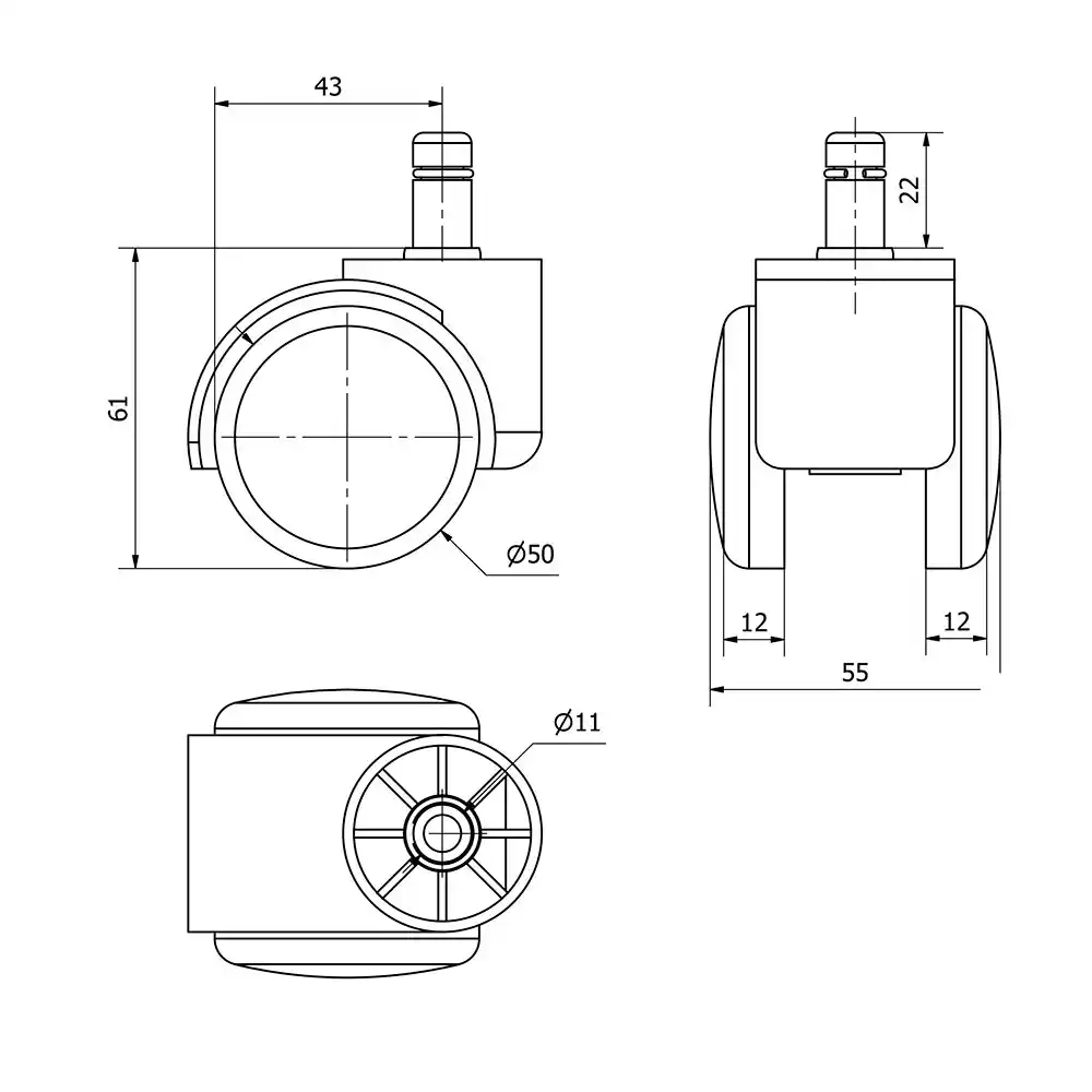 Esta rueda giratoria, fabricada en polipropileno plástico de color negro, está diseñada para facilitar el movimiento de muebles y cargas medianas con un peso de hasta 50 kg. Su espiga lisa y eje liso permiten una instalación sencilla y un giro suave. La espiga tiene unas dimensiones de 11 cm de largo por 12 cm de ancho, y la rueda cuenta con un diámetro de 5 cm. Gracias a su material resistente y ligero, es ideal para integrar en carros, mesas con ruedas o cualquier pieza que requiera desplazamiento ocasional.